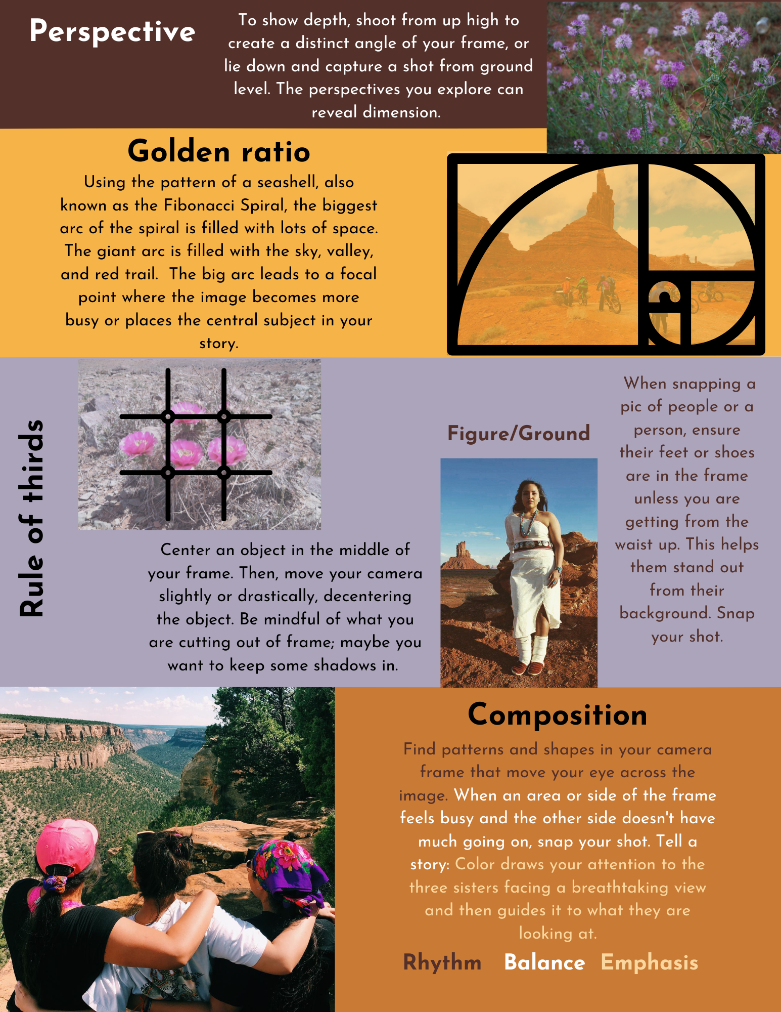 Composition is the art of how you place people, objects, or design elements in your photos, videos, or drawings. There are several things you can consider when composing your creations, such as the rule of thirds, the golden ratio, perspective, and more.